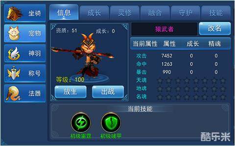 猿武者:火眼金睛,一棍扫四方的猿武者,通过宠物精华合成可获得。
