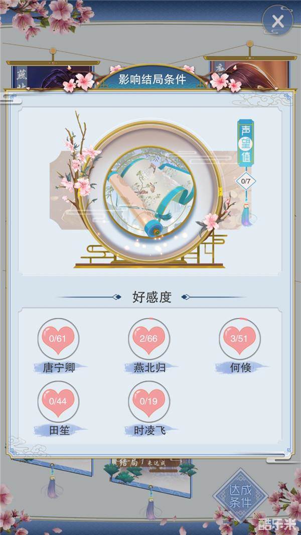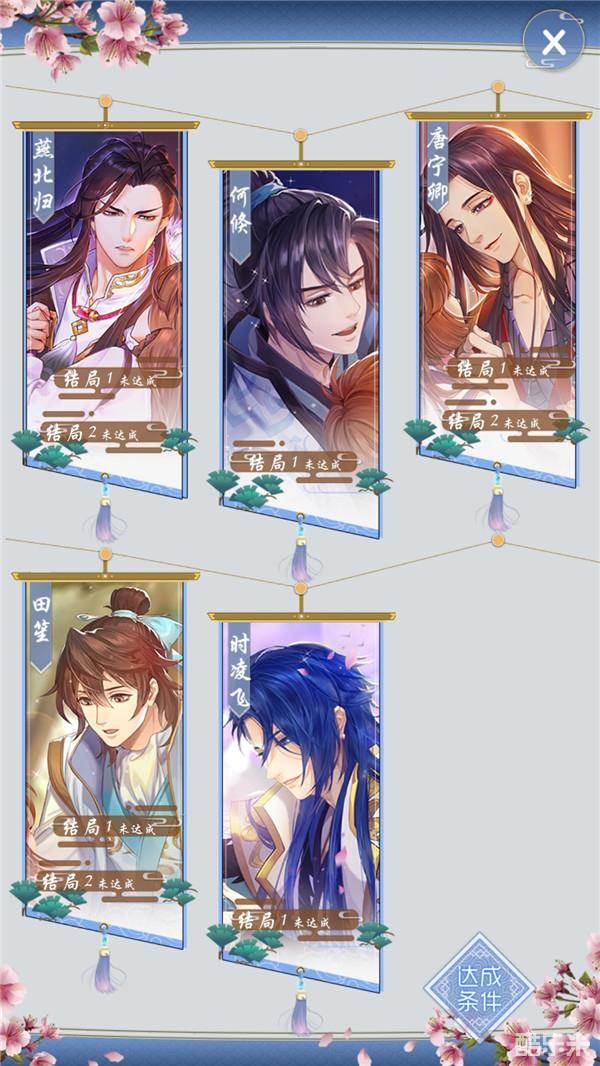 5)收集:主要用于展现已通关的男主结局部分故事会根据故事内的小玩法不同有其他收集内容。此外在结局收集页面可以点击右下角的“达成条件”,查看不同男主结局的达成条件。