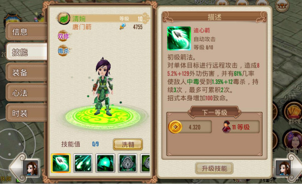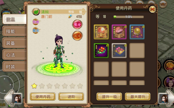 初入游戏,需要跟着剧情副本走,打打怪,轻松到达10级。在到达10级后,才可以开启特殊技能。这个过程中,你的角色可以通过信息、技能、装备、心法、时装的升级不断提升各种属性,同时也可以通过阵容进阶提升部分属性,这样才有足够的战力通过下一关~~下面具体说说角色各种功能的使用方法。以角色清婉为例: