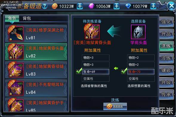 洗炼可以将材料装备的附加属性洗炼到待洗炼的装备身上,这时我们需要大量的可供选择的装备,每次洗炼会消耗一定的铜币。