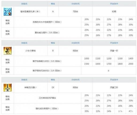 以下是WIKI的中文翻译以及技能和宝具的各等级效果。