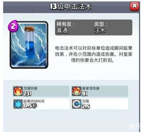 这张卡牌是一张两费用的低花费的圣水卡牌,可以进行辅助进攻时候使用,适用于我方的各种进攻卡牌套路,可以一次性解决对手的骷髅海和小蝙蝠,如果等级比对手亡灵大军、哥布林团伙、飞桶等级高一级就可以直接进行秒杀,对于赚取圣水费用有着不错的优势,同时这张卡牌还能打断对手地狱塔或者是煤气龙的持续攻击,也可以用于最后时候的斩杀使用,总之,这张卡对于玩家非常实用,希望大家可以在皇室中多多收集。