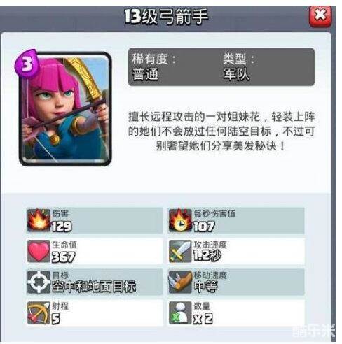 弓箭手是一组姐妹花的输出,在白卡中又有着即低费用,有可以进行空中和地面的双重输出攻击,同时攻击距离也是较远,可以远距离进行攻击对手,对于在后期卡牌的配置中也是有着独特的优势,并且很多高手在高阶场依然会使用。
