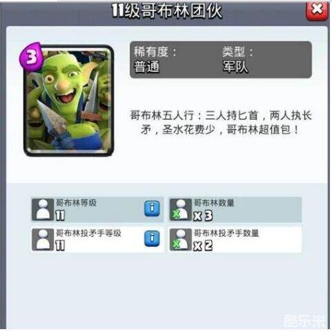 哥布林团伙是一张军队的群体卡牌,可以说是一张防御很强的卡牌,这张卡对于对手的野猪、野蛮人精锐、飞桶、矿工、墓园都有着不错的防御,同时拥有一定的对空能力,可以辅助空中进行防御。作为进攻使用可以是快速抢攻的卡牌,可以在敌人没有费用的时候进行桥头释放,一波奇袭,效果奇佳。