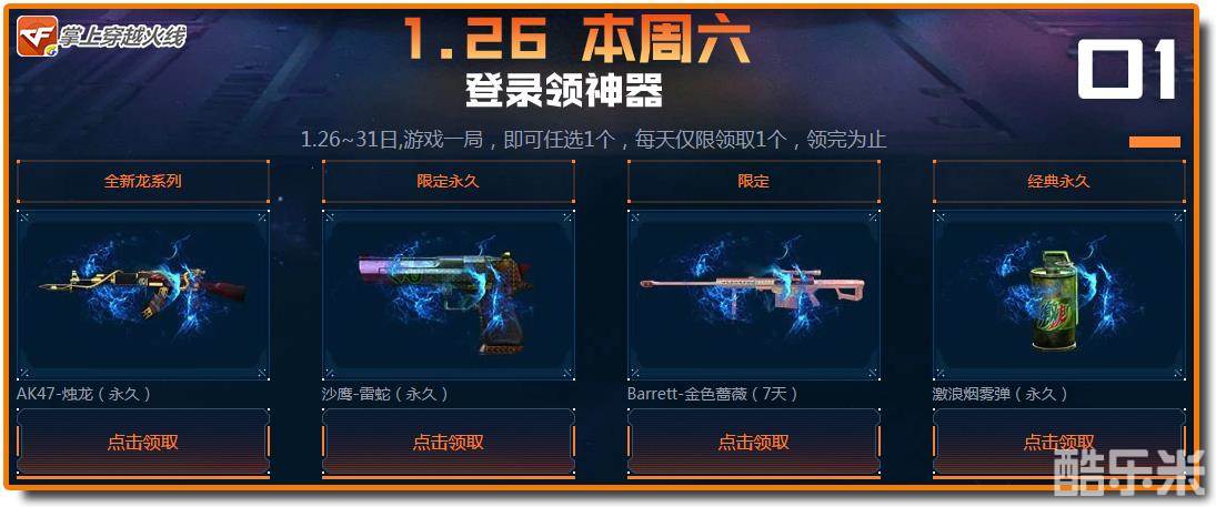 之前小编也爆料过春节预热活动的介绍文,这个福利当时并没有出现。可以看得出这个福利板块是这几天策划添加上去,让春节福利加倍的。1月26日(周六)登录领神器活动爆出了四件福利道具,分别是全新烛龙系列的AK47-烛龙、限定永久的沙鹰-雷蛇、英雄武器Barrett-金色蔷薇和经典永久激浪烟雾弹。