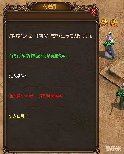 赤月传说白月门是一个全天地图,任何时候都可以通过NPC传送员进入,进入需扣除500点活力值,无双城员减半。活力值上限为3000,可通过在线慢慢恢复,在第二天登录时会满额恢复。