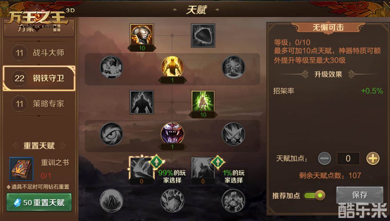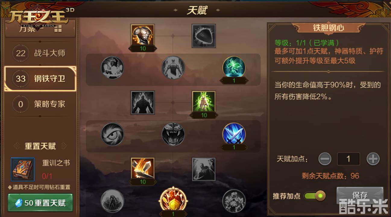 钢铁守卫:坚甲10、险境求生1、协调10、还击1、无懈可击10、铁胆钢心1