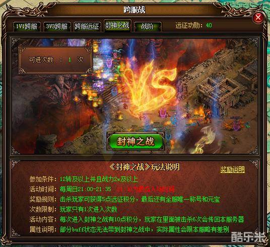 赤月传说封神之战在每周日的21:00-21:35分开启,玩家必须在21:30分之前入场,而且只有1次进入次数。此外,只有达到12转及以上并且战力2W及以上的玩家,才有资格参加这场旷世之战。未达到这个参加条件的玩家,可要多多努力啦!
