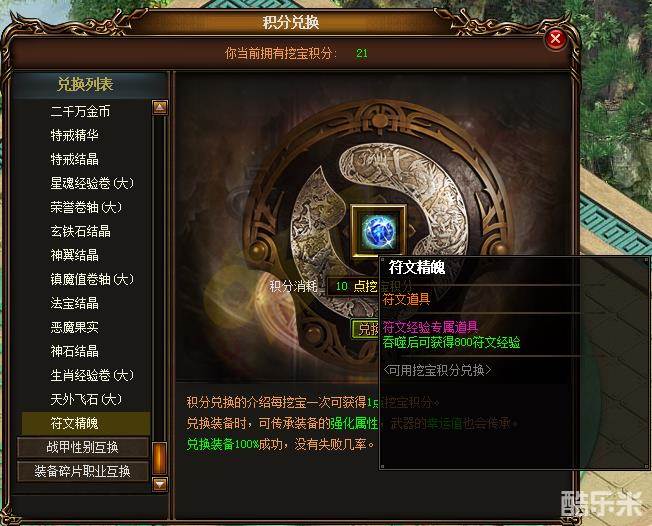 目前,符文精魄只有一个获取途径,那就是使用挖宝积分兑换,10点挖宝积分可兑换1个符文精魄。在赤月传说幸运挖宝中,每挖一次宝可获得一样宝物、1点挖宝积分、1点幸运值,挖宝积分可一直累加下去,但幸运值每天24点清空,大家可要注意啦!