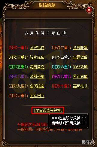 2、千服期间,1000挖宝积分可兑换1个主宰锻造符,活动期间每人只可兑换3个。