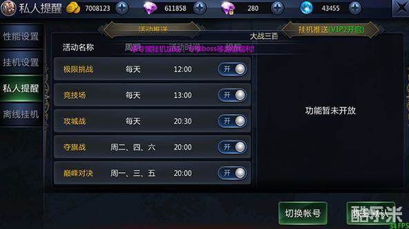 3、活动推送默认开启。挂机推送需要vip2,才能享有挂机推送的功能