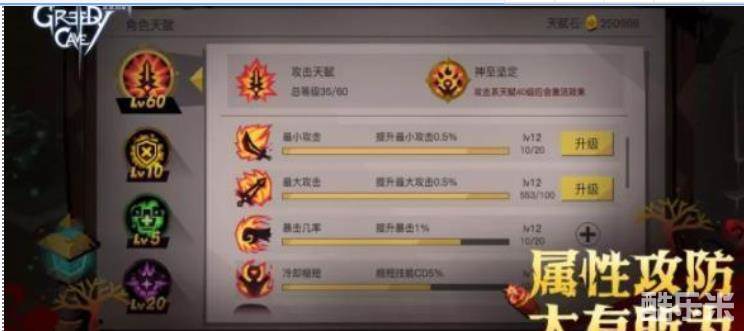 天赋系统从洞窟30层就能开启,靠每天完成随机的天赋任务来获取天赋石,通过消耗天赋石来获得天赋等级的提升。