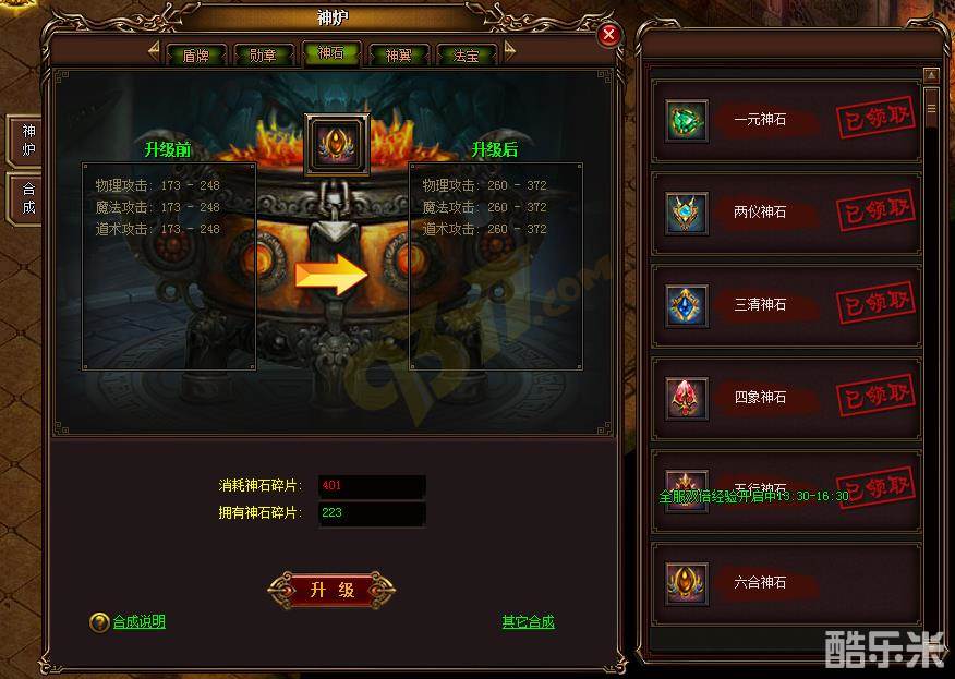 当你收集了足够的神石碎片之后,便可升级神石,提升你的攻击属性。