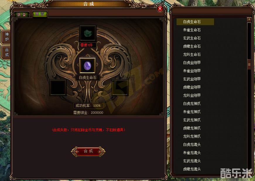 只要3件低一级的相同龙王装备+200W绑金即可合成1件高一级的龙王装备,龙王装备不论多高,所需的绑金都只要200W,比如白虎生命石=青龙生命石+200W绑金,朱雀生命石=白虎生命石+200W绑金;合成没有失败率,百分比成功。