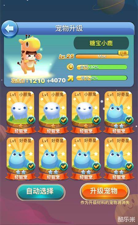 糖宝小鹿满级为25级,满级后攻击力为5280,金币加成为43%,得分加成为21%。在所有三星宠物当中,糖宝小鹿的综合属性排行中上!