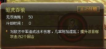 驱虎吞狼顾名思义,就是让敌人自相残杀的意思。荀?的绝技与树精技能的区别在于:1、100%中军混乱;2、提升攻击;荀?技能的混乱效果是100%触发的,因此不用担心概率的问题,同时提升混乱单位的攻击力可以保证该单位攻击友方时能有更多的伤害输出。