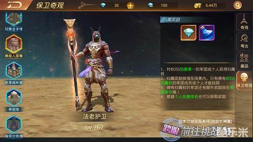 《文明曙光》每周三、六、日20:30会开启保卫奇观活动,该活动以军团为单位,玩家可进入奇观boss副本挑战奇观BOSS。活动结束时,对奇观boss输出最高的军团可获得奖励。