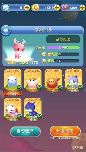 在宠物出战的界面,可以直接升级宠物。我们可以自己选择需要消耗的宠物来提供经验值,还可以自动选择全部的宠物升级消耗。在选择宠物之后,我们就可以在宠物等级的栏目中查看到获得的经验值。达到满级需要的经验值是比较大的。我们还是需要多多的孵化宠物提供更多的经验值的。