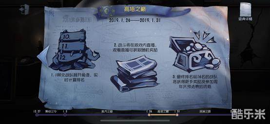 和此前蒸汽之都不同,高塔之巅将会引入直播环节,从1月25日至1月31日,每晚19点至21点,《第五人格》游戏内直播平台,会有特定的直播间对高塔之巅战斗进行解说,玩家可同步收看精彩游戏赛事。另外完成任务1-18的全服玩家,在直播间内观看一段时间,还有机会获得包括碎片、线索、印记、盛典宝箱在内的随机奖励。