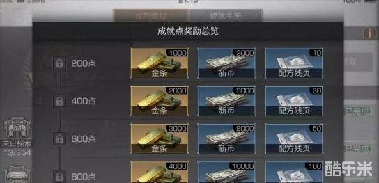 以200成就点为一个阶段,每达到一个阶段分即可获得金条、新币以及配方残页。