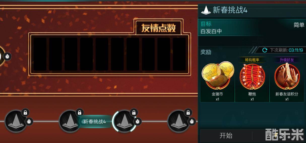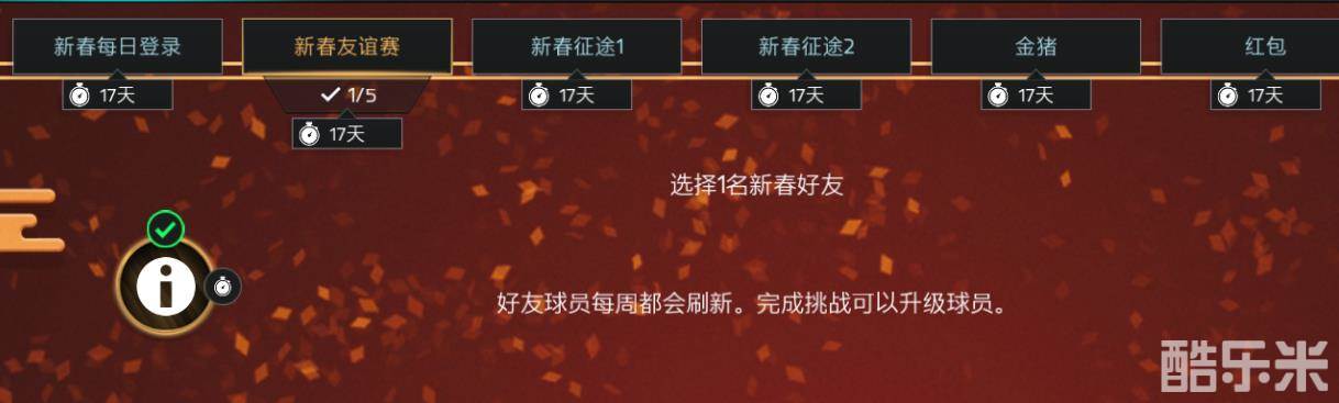 新春友谊赛章节,玩家可以从4位新春好友中选择1位开启挑战关卡,新春好友可以通过挑战关卡获得的友情点数升级,挑战关卡获取的征途门票可以在后面的征途章节使用,获取的对应积分可以在金猪和红包两个章节兑换相应奖励!