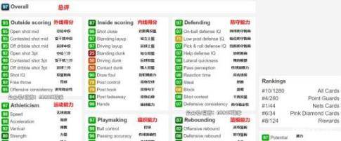 这张粉钻基德的属性总值给到了4101,六大项中有四项高光(外线得分、运动能力、组织能力、防守能力)和两项绿区(内线得分、篮板能力)。