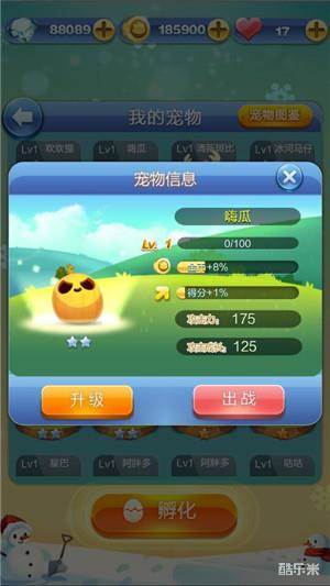 嗨瓜属于二星宠。在二星宠物中,嗨瓜的攻击力比较弱,得分加成也比较低,但是在金币加成方面却比较出色。一级嗨瓜的攻击力为175,攻击成长为125,金币加成为8%,得分加成为1%。
