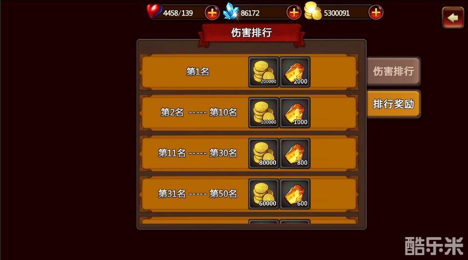 结束战斗后会根据玩家对BOSS造成的伤害进行排名统计,前10名根据名次高低获得特殊奖励,排名越高,奖励越丰厚。