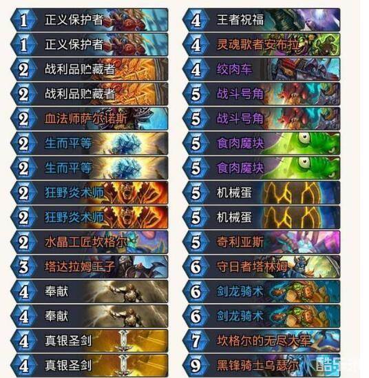 来自主播驴鸽同时也是外服主播Hibeepin登顶的一套亡语骑,构筑特点是非常偏向进攻,前期满编了正义保护者,战利品,炎术士等小随从,炎术士还能配合生平,奉献等法术清场,并且满编战斗号角有效膨胀场面,过滤牌库,采用绞肉车,机械蛋,魔块的亡语联动体系,并且带了三王子,前期复制绞肉车,机械蛋抢节奏,后期复制对面或者自己的大随从配合魔块也是一种操作手段,四费曲线带了王者祝福,在前期随从密度很高的情况下王者祝福也能发挥出很好效果,甚至是五费机械蛋,下回合可以王者祝福buff启动。并且这套构筑曲线除了橙法与dk外,最高六费封顶,没有带佛丁,圣疗,猛虎之神等高费牌,这也是为了针对猎人,otk卡组很多的环境。