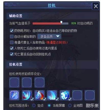 挂机范围功能,玩家可以从三种范围设置里选取一种进行区域内挂机,提供了定点挂机,当前屏幕挂机,全地图挂机
