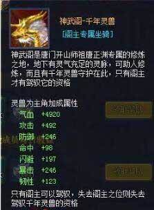 神武阁之战,给胜利分殿带来的就是无尽的荣耀。在战场上,获胜的分殿中战力最高的分堂,会拥有神武阁的入住权,其堂主成为神武阁阁主,有着专属的神武阁主标识和专属坐骑,其他成员也会获得每日收益、持续EXP收益等奖励!