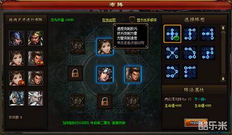 在KU25《御天三国》游戏中,有一个阵法系统。此阵法系统是一个全新的武将养成玩法,游戏中的阵容最多可出战9名武将,9人的站位,即对应9个相互独立的阵法,通过对阵法进行升级,可以提升对应站位上武将的能力属性。