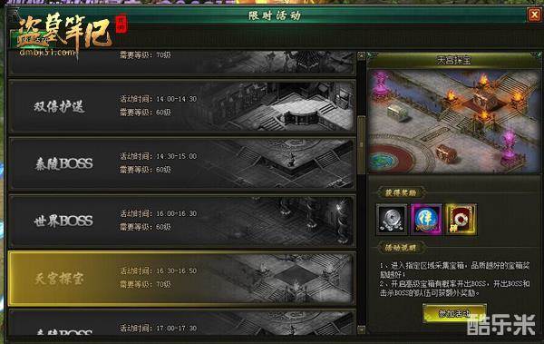 盗墓笔记天宫探宝活动开始时,场景内即会呈上第一批宝箱,之后每隔一段时间都会再次出现新宝箱,玩家开启宝箱即可立刻获得奖励。宝箱分为三种,每一种宝箱中都藏有神秘的物品。采集宝箱的奖励与玩家等级以及宝箱品质挂钩。但是本次探宝活动每人每天有采集上限哦,玩家们需要好好把握每一次采集宝箱的机会~