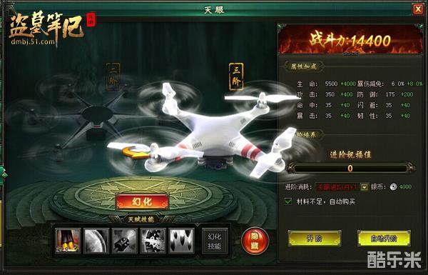 盗墓笔记游戏中的天眼可使用天眼进阶丹及及银币升阶,从而提高各项属性加成。天眼进阶丹可从商城或进阶副本中获取。和宠物、神武一样,天眼可进行幻化效果。但目前幻化功能未开启,幻化后的天眼即将拥有更多的功能以及更华丽的外观供玩家们选择。