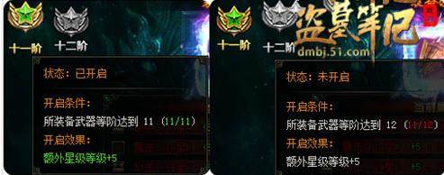 另外,当我们把装备等级提升到11阶以上时,更可以开启一个更强力的功能:额外星级提升,11阶装备可以额外提升5颗洗炼星级上限,12阶装备还可以再增加5颗洗炼星级效果。