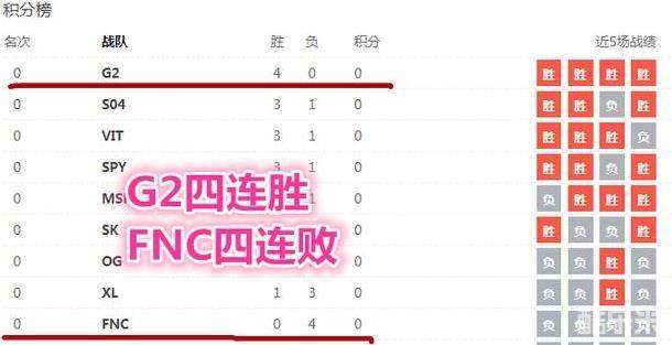 现在欧洲LEC联赛也已经开打很久了,FNC战队与G2战队又过得怎么样了呢?看看战绩就知道了,G2战队四连胜登上榜首,FNC战队战绩全败垫底!