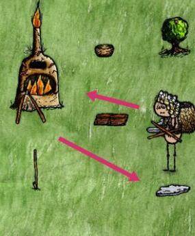 用原石迅速划向扁石上的热铁,要快不然铁会冷却,就白烧了