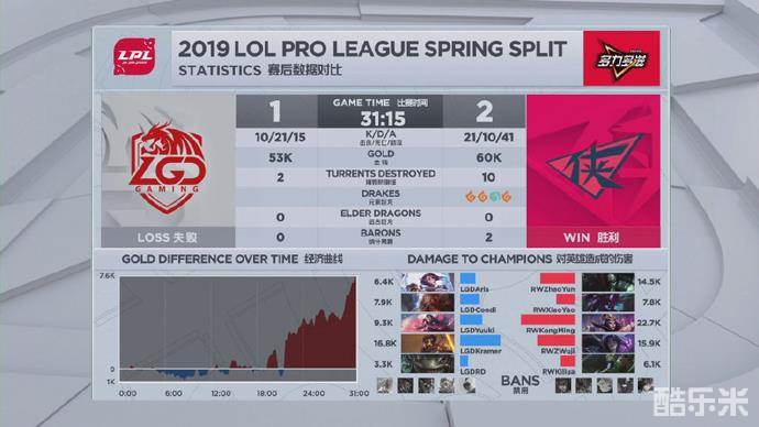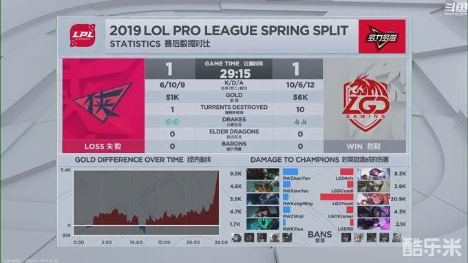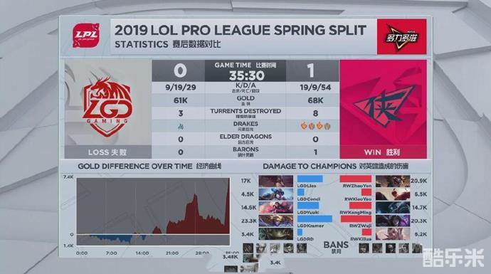 比赛的前期,RW的进攻节奏更优取得人头上的领先,而LGD吃防御塔镀层资源更多,因此双方经济并没有打出多少差距。