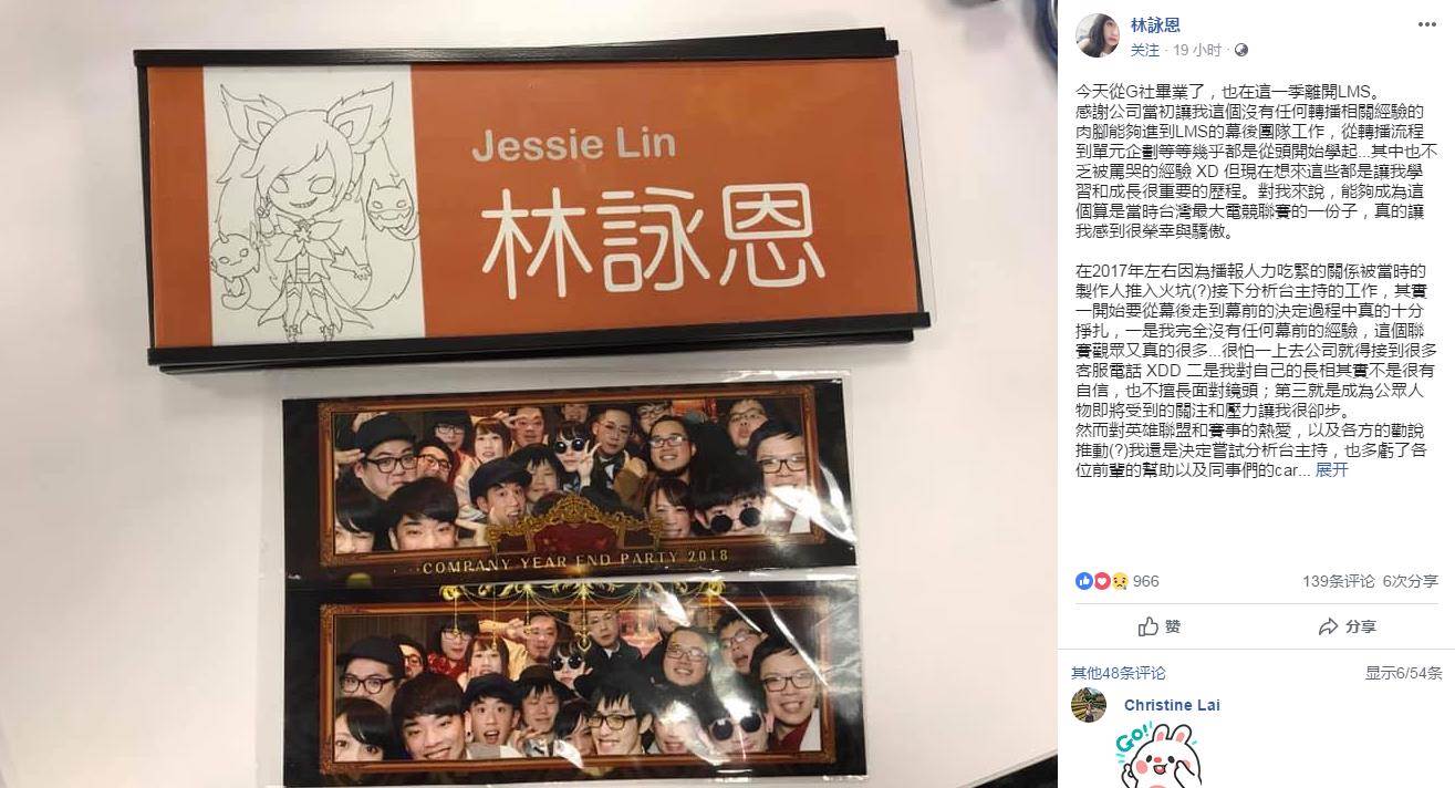 昨日晚间,SN战队中单选手Maple的女友,原LMS赛区著名女主持人之一的林咏恩(Jessie,又称RE)在自己的脸书主页上po出一张图片,并且写下大篇长文,向LMS宣告正式告别,退出LMS主持舞台。