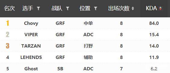 在LCK的KDA榜单上,GRF中单Chovy高达84排在第一位,紧随其后的是同队的Viper、Tarzan、Lehends三人,前五名中唯一一个上榜的非GRF的队员则是SB战队的adc Ghost。