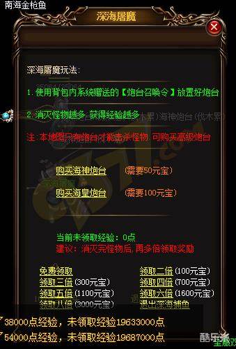 玩家在深海屠魔副本里面,可根据左侧的副本流程来做,将背包里的炮台都摆放好。系统仅免费赠送4个炮台,若你觉得炮台不够用,可花费元宝购买,海神炮台50元宝/个,海皇炮台100元宝/个。这两种炮台价格不同的原因,就是攻击方面不同,海皇炮台的会比较海神炮台高一倍。大家想获得更多经验值,不妨多买几个海皇炮台。这些炮台也不是无限摆放的,每轮只能使用16个任意炮台。