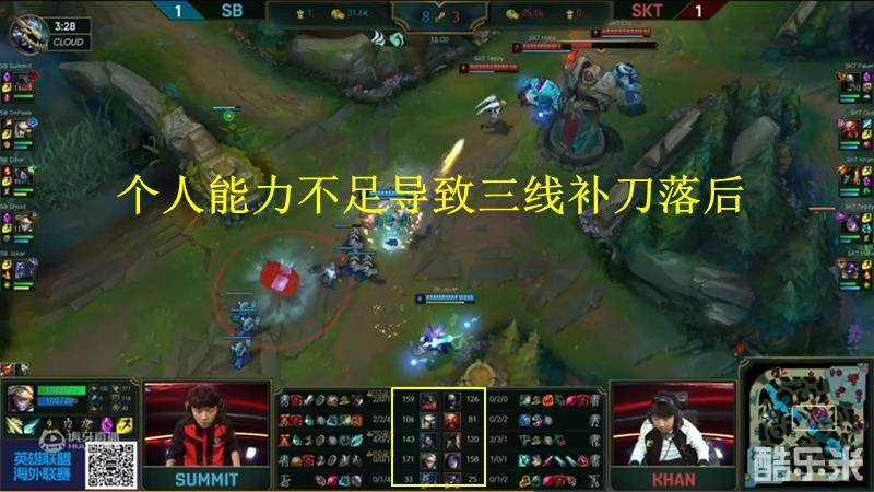 这一点已经遮不住了,三线劣势且8分钟平均被压15刀已经说明了问题。SKT首败暴露的最大短板就是Khan,对线能力和竞技状态下滑严重。SKT让需要发育的船长却走中,三场比赛都成为突破口,想不到当年被称为LCK第一上单的Khan居然也有今天。而比赛中Mata还贡献了一次预判闪现的操作,秀的观众头皮发麻!