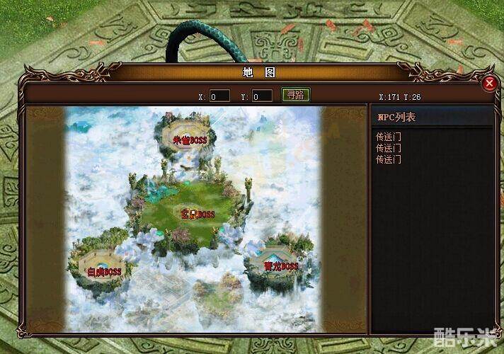 大家进入到天空圣兽台地图内,通过地图功能M,打开当前地图就能发现里的boss数量、boss大概位置所在哦。赤月传说天空圣兽台共有4只boss,分别是青龙boss、朱雀boss、白虎boss、玄武boss,这些boss刷新时间间隔均为60分钟,它们刷新不同的方位上,大家可结合地图功能寻找。