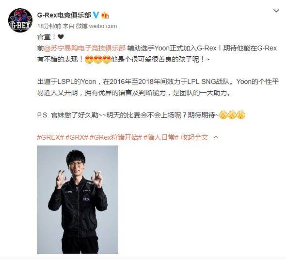前@苏宁易购电子竞技俱乐部辅助选手Yoon正式加入G-Rex!期待他能在G-Rex有不错的表现!他是个很可爱很善良的孩子呢!~