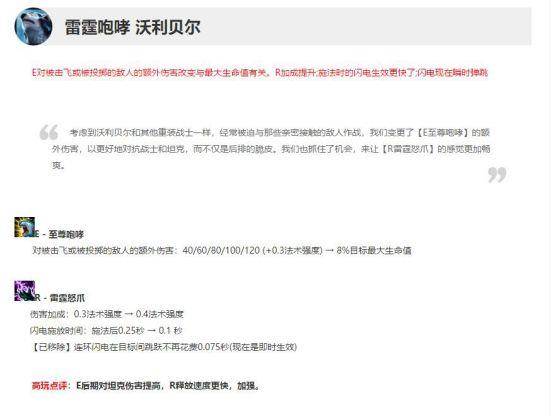 雷霆咆哮沃利贝尔在沉寂了许久之后终于获得了官方的青睐,E技能变为百分比最大生命值伤害,R技能释放速度更快,让上单出现在上单位置上的狗熊有了更高的输出能力。