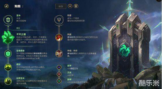 在符文选择方面,小编推荐大家选择主系坚决副系精密的符文搭配。主系中的不灭之握和过度生长可以保证狗熊的血量,调节能够提高它的双抗增加生存能力,生命源泉可以提高对线和团战时的续航能力。而凯旋和传说:欢欣则是为了能够让狗熊打出更多的伤害。这套符文兼顾生存能力和输出能力,非常符合目前上单战士的需要。