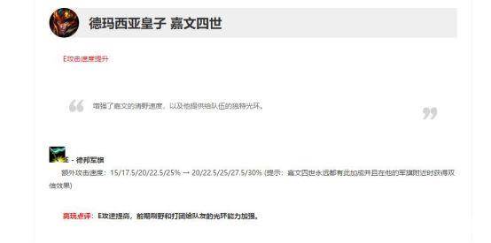 E技能的攻速加成,在团战时对于队友的帮助也非常大。如果己方队伍中有嘉文四世的存在,那么ADC一定是最为开心的了。
