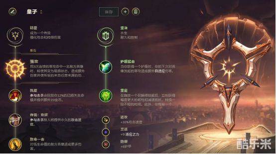在上单位置上,小编推荐各位召唤师在使用皇子的时候选择输出流的符文。基石符文选择强攻,这样可以最大化E技能加强带来的伤害收益。传说:欢欣配合技能被动能够加强皇子的清线能力,致命一击和护盾猛击可以进一步提高皇子的伤害。由于皇子经常需要先手开团,因此小编选择了凯旋和坚定来增加生存能力并缩短控制技能的影响。