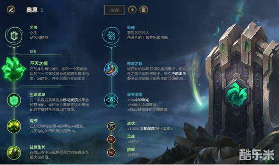 符文方面小编推荐大家选择偏向坦克的发育符文。同时搭配冷却缩减来降低技能的冷却时间,增加控制能力。一个善于用大招打乱阵型并且能够为全队提供装备支撑的奥恩,会是对手的噩梦。