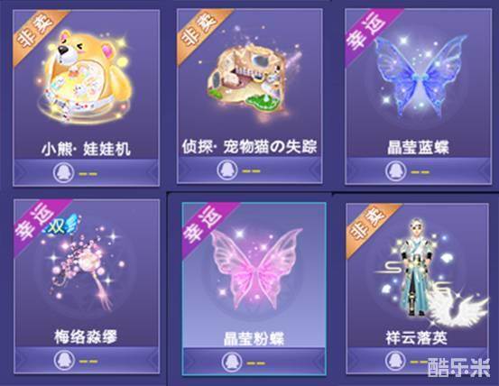 还有新款翅膀晶莹蓝蝶、晶莹粉蝶,人气翅膀梅络淼缪,以及新款服饰祥云落英、鸿武遇情、莹星凉月等其他热门道具!